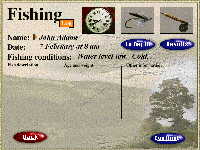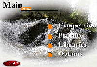 ゲームのスタート画面競技、練習、情報、各種オプションが選択できます。情報(Libraries)には、 魚の紹介とかFlyの道具の説明などがきれいな画像と共に紹介されています。 |
